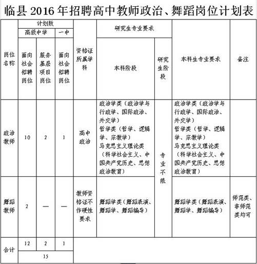 附:臨縣2016年招聘高中教師政治、舞蹈崗位計(jì)劃表