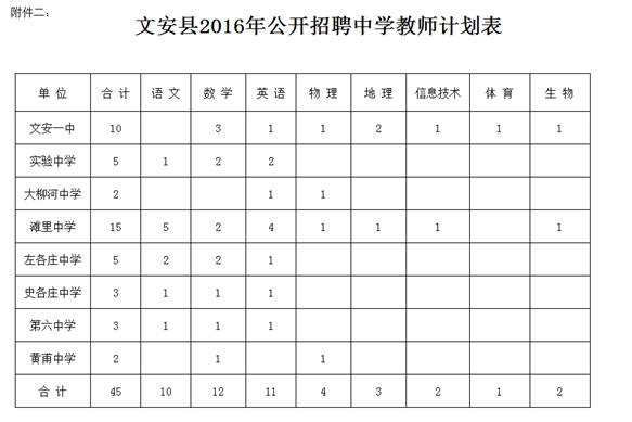 河北省廊坊市文安縣2016年中學(xué)教師招聘計劃表(45名)