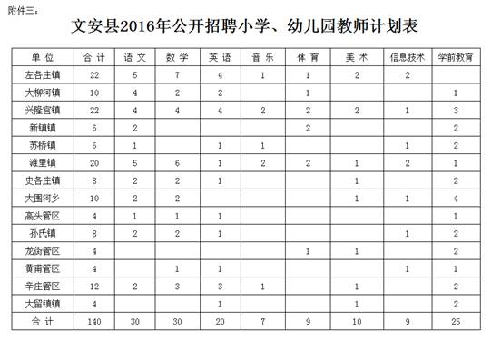 河北省廊坊市文安縣2016年小學(xué)、幼兒園教師招聘計劃表(145名)