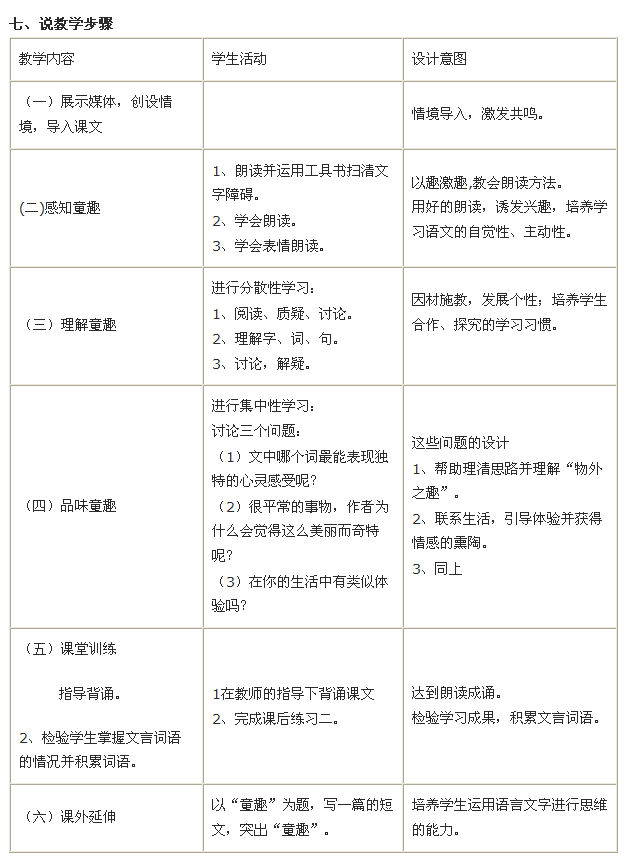 教學(xué)本課,我采用“線索式”教學(xué)思路,即“一線串珠”式的整體閱讀教學(xué)思路,這是一種創(chuàng)新式的教學(xué)思路。用錢(qián)夢(mèng)龍老師的話來(lái)講,就是通過(guò)對(duì)課文的認(rèn)真分析,找到一個(gè)“牽一發(fā)而動(dòng)全身的關(guān)鍵問(wèn)題”把解決這個(gè)問(wèn)題作為中心目標(biāo),使語(yǔ)言、篇章等方面的學(xué)習(xí)都成為達(dá)到這個(gè)中心目標(biāo)的過(guò)程或手段,并在探討這個(gè)目標(biāo)問(wèn)題的過(guò)程中,完成教學(xué)任務(wù)。這個(gè)關(guān)鍵問(wèn)題就是“怎樣理解文中的童真童趣!蔽以O(shè)計(jì)了如下步驟: