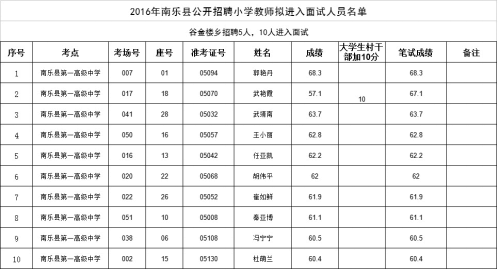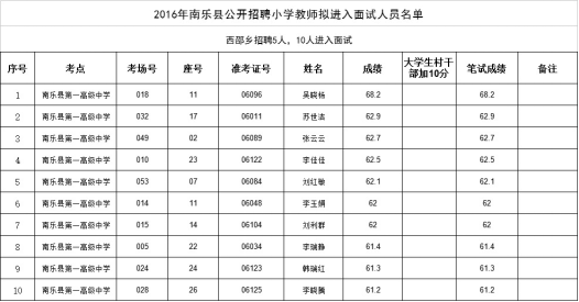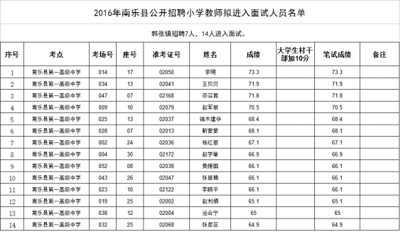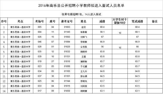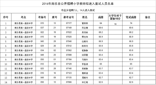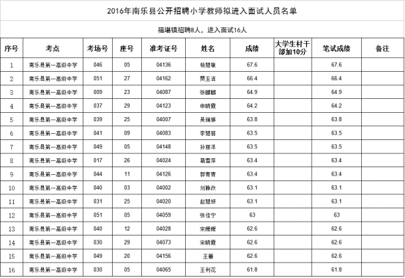 2016年河南省濮陽(yáng)市南樂(lè)縣小學(xué)教師招聘擬進(jìn)入面試人員名單