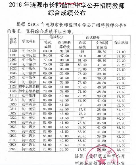 2016年湖南省漣源市長郡藍田中學教師招聘綜合成績公布