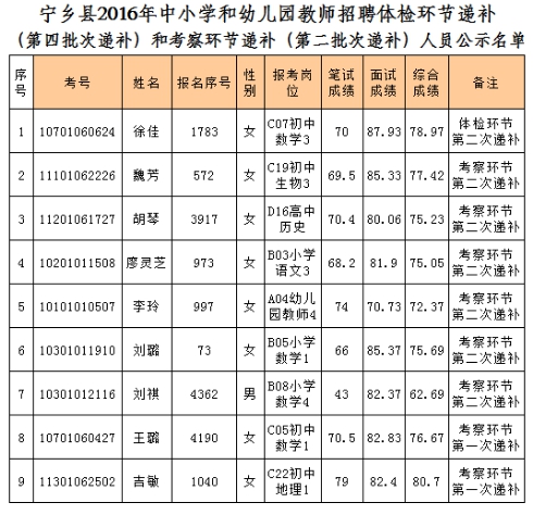 在體檢環(huán)節(jié)(第三批次遞補(bǔ))的過程中,有1名考生放棄體檢資格,在考察(資格審查)環(huán)節(jié)的過程中,有6名遞補(bǔ)考察對(duì)象放棄體檢資格,有2名考察對(duì)象放棄考察(資格終審)資格,根據(jù)招聘公告規(guī)定,棄權(quán)者,則從同一崗位中按總成績(jī)從高分到低分依次遞補(bǔ)(同一崗位遞補(bǔ)不超過兩次),F(xiàn)將遞補(bǔ)名單公示如下(見附表)。
