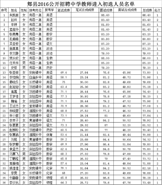 郟縣2016年公開招聘中學(xué)教師面試成績及總成績公示