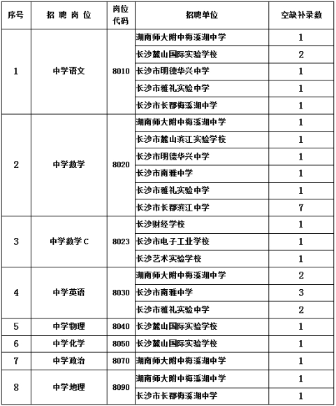 本次空缺崗位補(bǔ)充錄用的對(duì)象為:在2016年長(zhǎng)沙市教育局直屬單位教師招聘中,報(bào)考崗位為本次補(bǔ)充錄用崗位,且考核成績(jī)達(dá)合格分?jǐn)?shù)(80分)及以上的人員(共104人,詳見附件)。