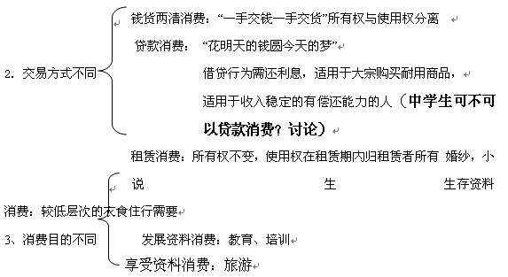 本框題的教學(xué)三個目,影響消費的因素這一目需教師靈活處理的,課本講了三方面的因素,其中居民收入和物價水平是最主要因素,但歸根到底都是由經(jīng)濟的發(fā)展水平?jīng)Q定的,同時由這些因素我們可以而且有必要引導(dǎo)學(xué)生總結(jié)出提高消費水平的途徑和方法,這兩處都需求要教師歸納總結(jié)的.消費的類型這一目高考主要以選擇題的形式出現(xiàn),主要考查學(xué)生判斷某種消費行為屬于哪一種消費類型,所以這一目只需用實例簡單解釋說明.消費結(jié)構(gòu)這一目重點通過引導(dǎo)學(xué)生分析課本近幾年的我國恩格爾走勢圖來把握恩格系數(shù)和消費結(jié)構(gòu)變化的意義,引導(dǎo)學(xué)生總結(jié)出其根本原因也在于經(jīng)濟的發(fā)展.