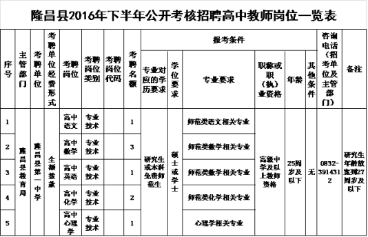 4、符合本公告招聘崗位所需的其他具體條件及資格要求,詳見《隆昌縣2016年下半年公開考核招聘高中教師崗位一覽表》(附件1)。(研究生或本科免費師范生)