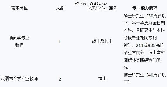 根據(jù)2012滁州學(xué)院進(jìn)人計(jì)劃安排,文學(xué)與傳媒學(xué)院目前還急需引進(jìn)漢語言文學(xué)和新聞學(xué)專業(yè)教師3名,具體要求如下: