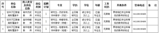 因工作需要,經(jīng)上級部門同意,大連市甘井子區(qū)教育系統(tǒng)增加3個(gè)高中招聘崗位,如下: