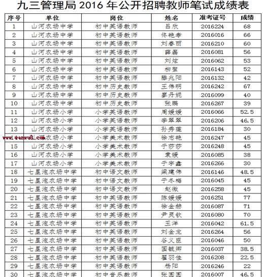 黑龍江省黑河市九三管理局2016年公開(kāi)招聘教師筆試成績(jī)
