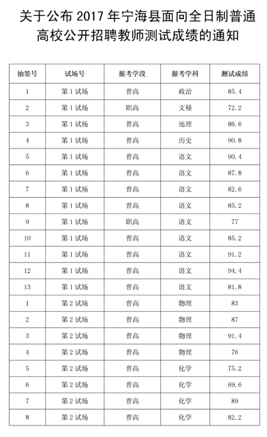 2017年浙江省寧波市寧海縣教師招聘測試成績的通知1