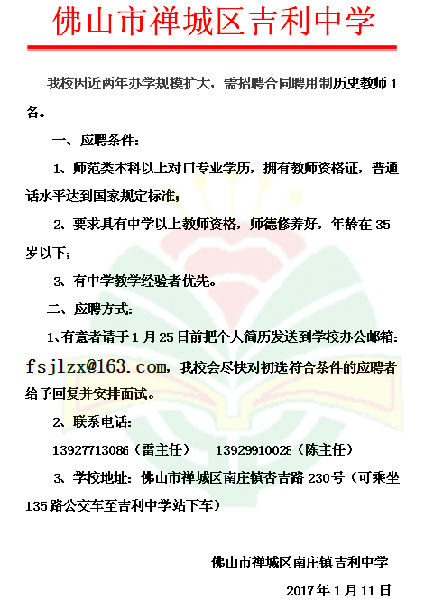 2017年廣東省佛山市禪城區(qū)南莊鎮(zhèn)吉利中學(xué)教師招聘信息