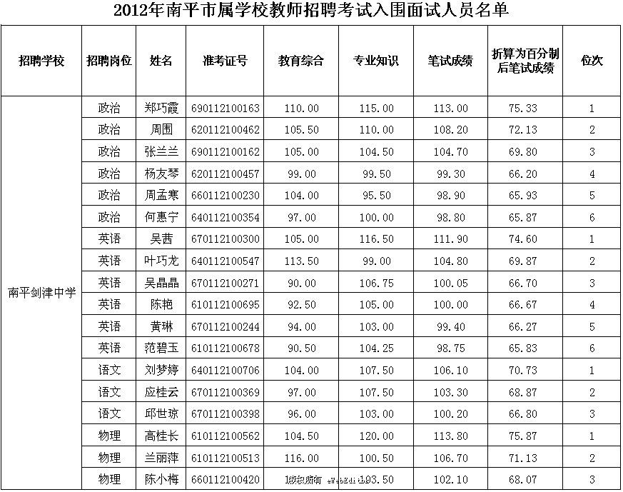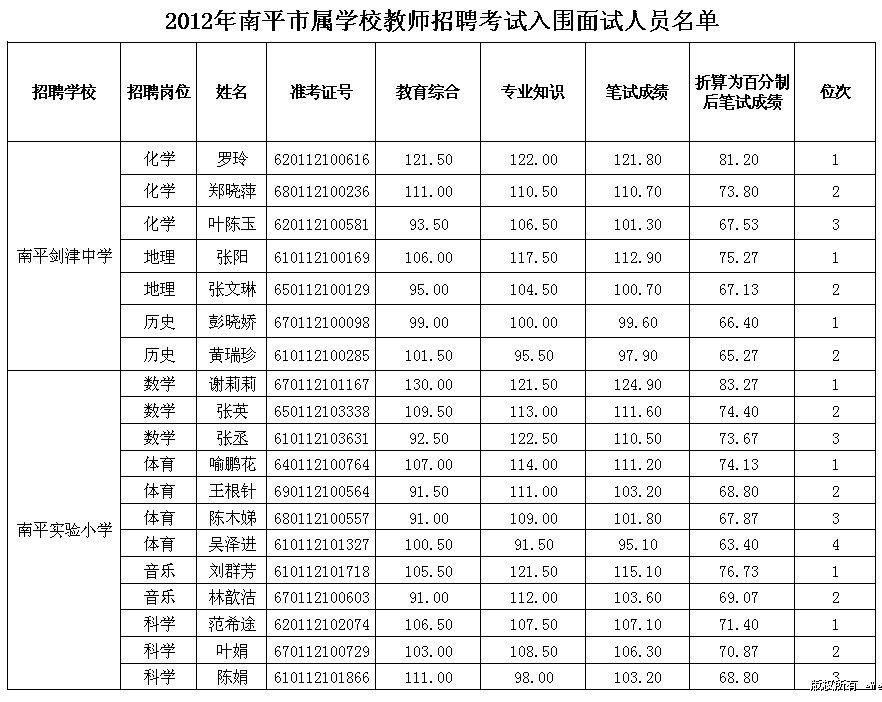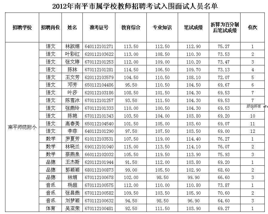 福建省南平市屬五所學(xué)校2012年教師招聘入圍面試人員名單公告