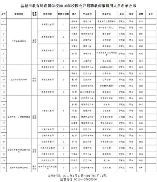 江蘇省鹽城市教育局直屬學(xué)校2016年校園教師招聘擬聘人員名單公示