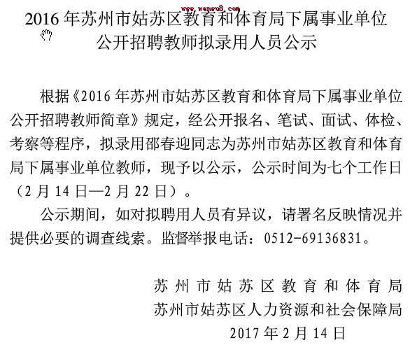 2016年江蘇省蘇州市姑蘇區(qū)教育和體育局下屬事業(yè)單位教師招聘擬錄用人員公示