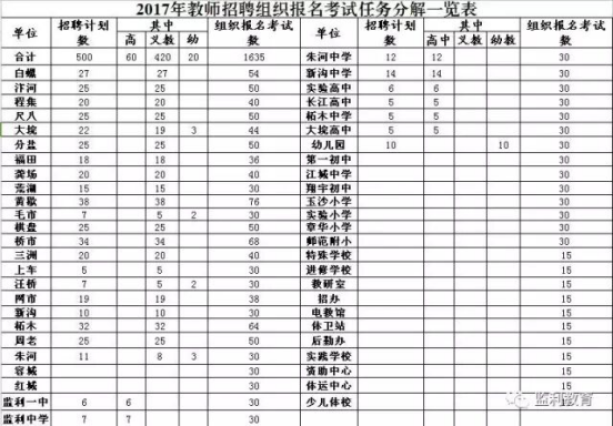 我縣2017年面向社會(huì)公開(kāi)招聘500名中小學(xué)教師,其中高中教師60名、初中教師40名、小學(xué)教師380名、幼兒園教師20名。