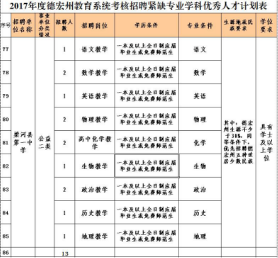 2017年梁河縣第一中學(xué)擬招騁緊缺專業(yè)學(xué)科優(yōu)秀教師13人,具體要求見下表: