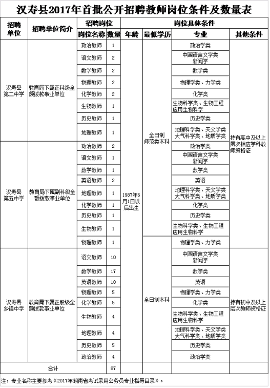 湖南省常德市漢壽縣2017年首批教師招聘崗位及數(shù)量(87名)