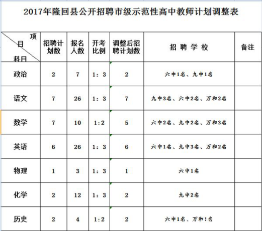 根據(jù)《2017年隆回縣公開招聘市級示范性高中教師公告》的要求,結(jié)合報名實際情況,經(jīng)研究,報縣事業(yè)單位公開招聘工作領(lǐng)導小組同意,并報市人力資源和社會保障局批準,現(xiàn)將2017年隆回縣公開招聘市級示范性高中教師崗位計劃和開考比例調(diào)整如下,具體見附表。