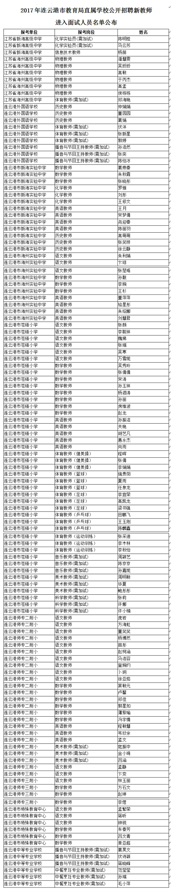 2017年連云港市教育局直屬學(xué)校公開招聘新教師進入面試人員名單公布通知
