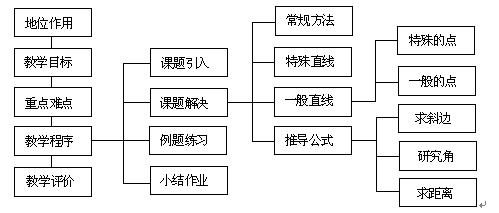 本節(jié)課是“兩條直線的位置關(guān)系”的最后一個(gè)內(nèi)容,在復(fù)習(xí)引入時(shí),有意識(shí)地涉及兩直線垂直、兩直線的交點(diǎn)等知識(shí),既幫助學(xué)生整理、復(fù)習(xí)已學(xué)知識(shí)的結(jié)構(gòu),也讓學(xué)生在復(fù)習(xí)過(guò)程中自己“發(fā)現(xiàn)”尚未解決的問(wèn)題,使新授知識(shí)在原認(rèn)知結(jié)構(gòu)中找到生長(zhǎng)點(diǎn),自然地引出新問(wèn)題,符合學(xué)生的認(rèn)知規(guī)律,有利于學(xué)生形成合理、完善的認(rèn)知結(jié)構(gòu)。教學(xué)過(guò)程中,逐步逼近目標(biāo),在這過(guò)程中展示了數(shù)學(xué)知識(shí)產(chǎn)生的思維過(guò)程。學(xué)生能夠自覺(jué)地、主動(dòng)地參與進(jìn)來(lái),教師的主導(dǎo)作用、學(xué)生的主體作用都得以充分體現(xiàn),經(jīng)常這樣做,學(xué)生的數(shù)學(xué)思維能力必將逐步得到提高。在教學(xué)中只要抓住“構(gòu)造一個(gè)可用的三角形”這個(gè)關(guān)鍵,就能突破難點(diǎn),還可以采用其他的方法推導(dǎo)“點(diǎn)到直線的距離”公式,易于學(xué)生的理解和掌握。