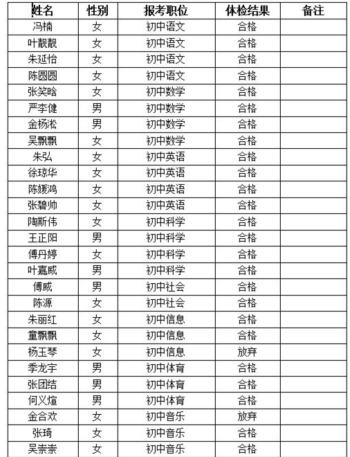 現(xiàn)將2017年浦江縣教育系統(tǒng)公開招考教師及引進(jìn)優(yōu)秀畢業(yè)生體檢結(jié)果公布如下。考生對(duì)非當(dāng)日、非當(dāng)場(chǎng)復(fù)檢的體檢項(xiàng)目結(jié)果有疑問的,可自體檢結(jié)果公布之日起7日內(nèi)向浦江縣教育局人事科提出復(fù)檢書面申請(qǐng),逾期視為自動(dòng)放棄。