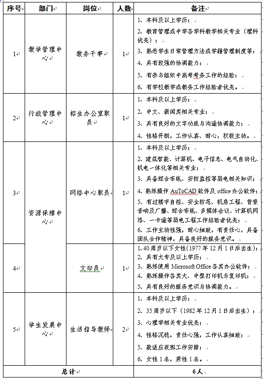 為滿足我校下一學(xué)年六個(gè)年級(jí)教育教學(xué)輔助工作需求,保障各項(xiàng)工作有序、順利開展,按照《中共陜西省委、陜西省人民政府關(guān)于貫徹〈國家中長期教育改革和發(fā)展規(guī)劃綱要(2010-2020年)〉的實(shí)施意見》(陜發(fā)〔2010〕10號(hào)),經(jīng)秦漢新城管委會(huì)批準(zhǔn),在秦漢新城管委會(huì)教育局的指導(dǎo)下,本著公開程序、公平競(jìng)爭(zhēng)、堅(jiān)持標(biāo)準(zhǔn)和擇優(yōu)聘用的原則,現(xiàn)面向社會(huì)公開招聘職員6名;同時(shí),根據(jù)學(xué)校下一學(xué)年后勤保障工作需要,擬招聘6名工勤崗位人員(均屬臨聘崗位)。招聘計(jì)劃具體如下: