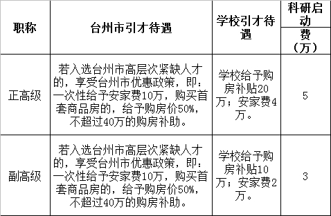 1.對(duì)于引進(jìn)臺(tái)州市內(nèi)的教師,具有正高級(jí)或副高級(jí)職稱的分別給予5萬、3萬元的科研啟動(dòng)經(jīng)費(fèi)。