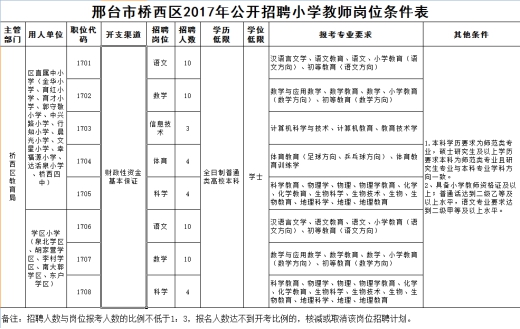 附件:《邢臺市橋西區(qū)2017年公開招聘小學(xué)教師崗位條件表》。