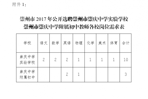 附件:1.崇州市2017年公開選聘崇州市崇慶中學(xué)實驗學(xué)校、崇州市崇慶中學(xué)附屬初中教師崗位需求表
