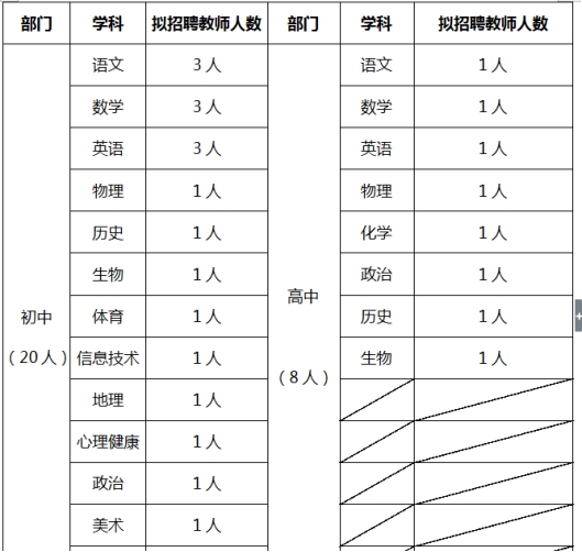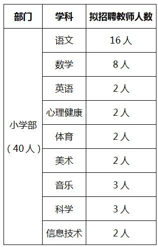 今年,兩校擬招聘教師共計68人,其中小學(xué)40人,中學(xué)28人。中小學(xué)具體崗位見下表: