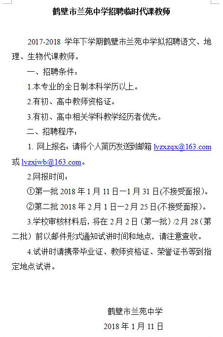 2018年河南省鶴壁市蘭苑中學(xué)教師招聘信息