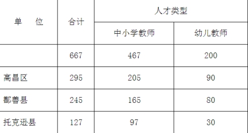 吐魯番市教育局作為教師招聘用人單位,按照市委人才工作會議精神,擬面向社會公開招錄中小學、幼兒園教師667人,其中:擬聘中小學教師467人、幼兒園教師200人。