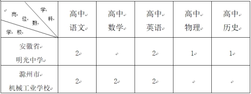 為加強(qiáng)示范高中和國家級中等職業(yè)教育改革發(fā)展示范校教師隊伍建設(shè), 進(jìn)一步提高安徽省明光中學(xué)和滁州市機(jī)械工業(yè)學(xué)校教育教學(xué)質(zhì)量,經(jīng)明光市公開引進(jìn)教育緊缺學(xué)科和專業(yè)人才工作領(lǐng)導(dǎo)小組會議研究,決定面向高校引進(jìn)優(yōu)秀應(yīng)屆畢業(yè)生12名(其中安徽省明光中學(xué)6名,滁州市機(jī)械工業(yè)學(xué)校6名),F(xiàn)將有關(guān)事項公告如下。