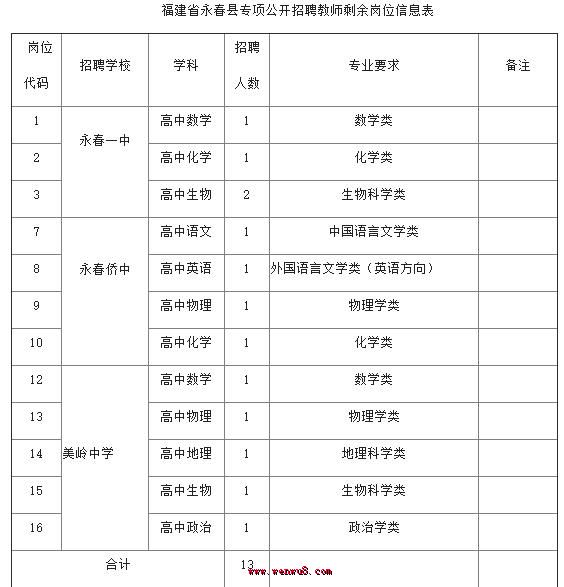 本次專(zhuān)項(xiàng)招聘剩余職位13個(gè),其中:永春一中4個(gè)、永春僑中4個(gè)、美嶺中學(xué)5個(gè),具體情況詳見(jiàn)《福建省永春縣專(zhuān)項(xiàng)公開(kāi)招聘教師剩余崗位信息表》(附件1)。