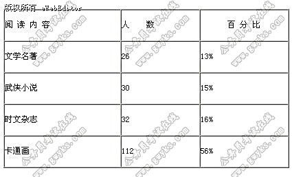 5、下面是一份對(duì)200名初中生課外閱讀情況的調(diào)查統(tǒng)計(jì)表,請(qǐng)根據(jù)這個(gè)統(tǒng)計(jì)情況,完成下列各題。(2分)