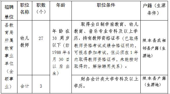 根據(jù)《竹溪縣事業(yè)單位公開招聘工作人員暫行辦法》(溪辦發(fā)[2009]35號),結(jié)合事業(yè)單位編制、崗位空缺情況及工作需要,按照“公開、平等、競爭、擇優(yōu)”的原則,面向社會公開招聘鄉(xiāng)鎮(zhèn)幼兒教師27名、專業(yè)會計3名(全額事業(yè)編制),F(xiàn)將有關(guān)事項公告如下: