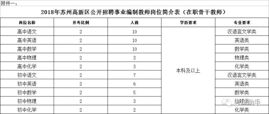 根據(jù)《蘇州高新區(qū)、虎丘區(qū)機(jī)關(guān)事業(yè)單位公開招聘工作人員暫行辦法》(蘇高新辦[2014]239號(hào))和《蘇州高新區(qū)、虎丘區(qū)機(jī)關(guān)事業(yè)單位高層次人才引進(jìn)實(shí)施辦法》(蘇高新管[2014]108號(hào))文件精神,經(jīng)蘇州高新區(qū)管委會(huì)批準(zhǔn),2018年蘇州高新區(qū)所屬公辦中學(xué)面向社會(huì)公開招聘事業(yè)編制教師73名。