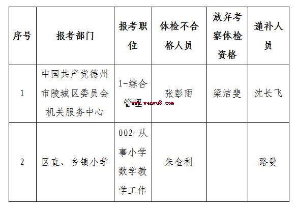 根據(jù)《2018年德州市陵城區(qū)事業(yè)單位公開招聘工作人員簡章》、《2018年德州市陵城區(qū)公開招聘教師簡章》、《關(guān)于做好2018年陵城區(qū)事業(yè)單位公開招聘工作人員考察工作的通知》、《2018年德州市陵城區(qū)事業(yè)單位公開招聘工作人員考察遞補和體檢通知》和《2018年德州市陵城區(qū)公開招聘教師考察遞補和體檢通知》相關(guān)規(guī)定,現(xiàn)將考察體檢遞補人員公告如下: