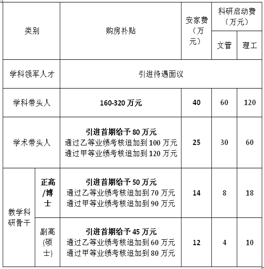 備注:所有引進(jìn)待遇中均包含市政府提供的40萬購房補(bǔ)貼和10萬安家費(fèi)(具體按照上級相關(guān)文件執(zhí)行)