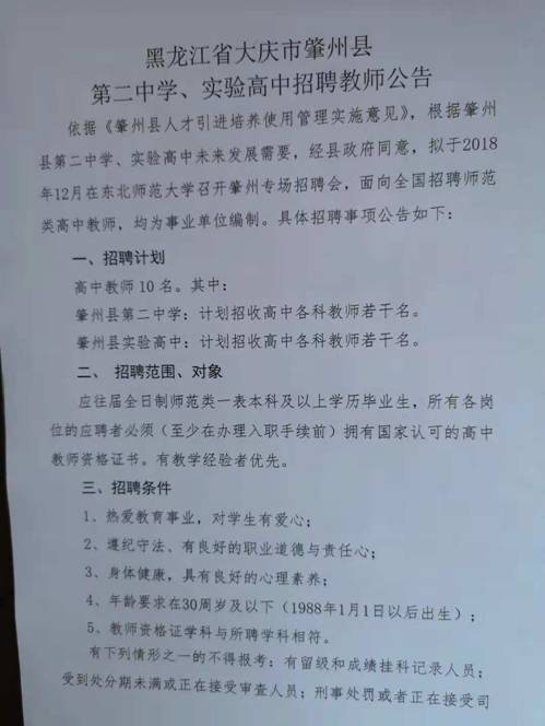 黑龍江事業(yè)單位招聘:2018黑龍江大慶肇州第二中學(xué)、實驗高中招聘教師10人公告 已發(fā)布,編主特別整理了公告相關(guān)信息,以下是公告詳情: