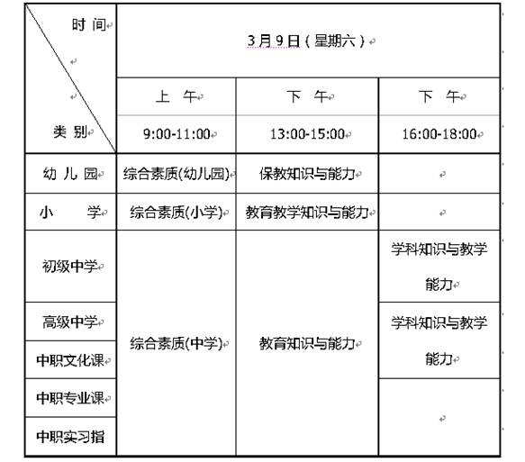(一)全國中小學教師資格考試(筆試)日期為2019年3月9日,具體時間安排如下: