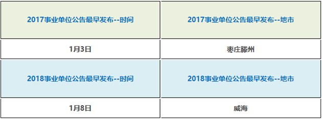 2017年事業(yè)單位招聘簡章,最早發(fā)布的地市是棗莊滕州,是在1月3日晚發(fā)布的。1月3日是元旦假期后正式上班的第一天。