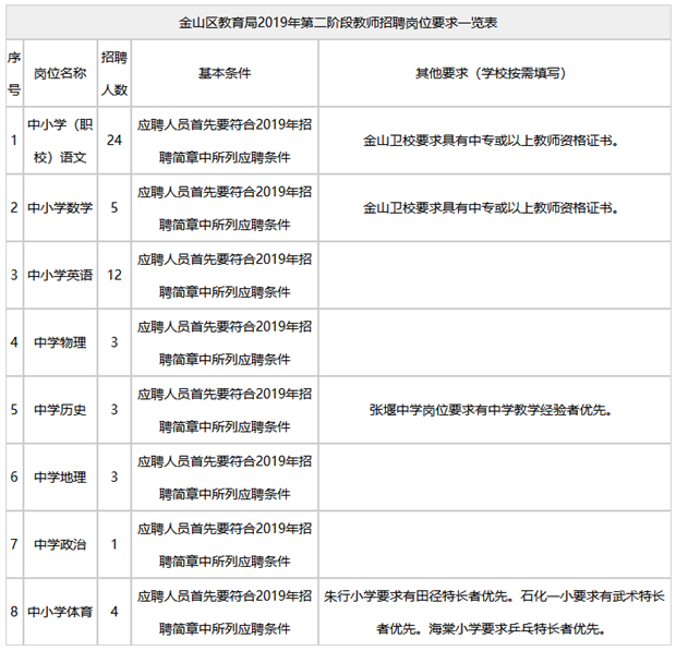2019金山區(qū)教師招聘崗位要求一覽表