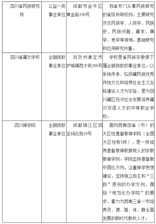 本次招聘均在事業(yè)單位經(jīng)批準(zhǔn)設(shè)置的崗位內(nèi)招聘,招聘名額為10名,其中民族雜志社2名、四川省民族研究所2名、四川省藏文學(xué)校4名、四川神學(xué)院2名,具體崗位見《崗位和條件要求一覽表》。