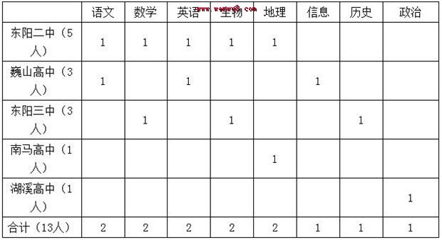 一、招聘單位:東陽市第二高級中學(xué)、東陽市第三高級中學(xué)、東陽市巍山高級中學(xué)、東陽市湖溪高級中學(xué)、東陽市南馬高級中學(xué)。