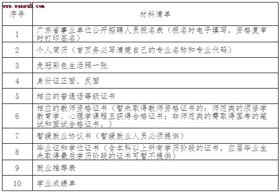 2.應(yīng)聘人員填寫《廣東省事業(yè)單位公開招聘人員報(bào)名表》,個(gè)人簡歷,連同本人免冠彩色生活照(原圖)、身份證、普通話等級(jí)證書、教師資格證書或“兩學(xué)(教育學(xué)、心理學(xué))”合格證(成績單)、畢業(yè)證書、學(xué)位證書、就業(yè)推薦表、學(xué)業(yè)成績單及其他相關(guān)材料掃描成彩色電子版,并嚴(yán)格按下表材料清單順序把所有材料打包在同一個(gè)PDF文檔中,不按要求報(bào)名者一律不予受理。