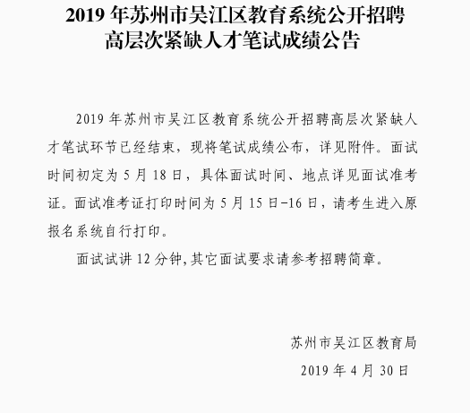 2019年蘇州市吳江區(qū)教育系統(tǒng)公開(kāi)招聘高層次緊缺人才筆試成績(jī)公告