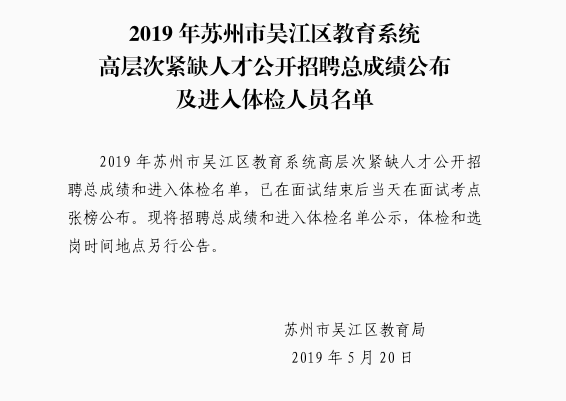 2019年蘇州市吳江區(qū)教育系統(tǒng)高層次緊缺人才公開招聘總成績公布及進入體檢人員名單