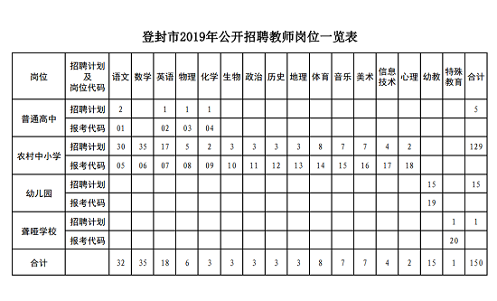 2019年我市計劃面向社會公開招聘教師150名,其中普通高中教師5名,農(nóng)村初中、小學(xué)教師129名,幼兒園教師15名,特殊教育學(xué)校教師1名(具體崗位見附表)。